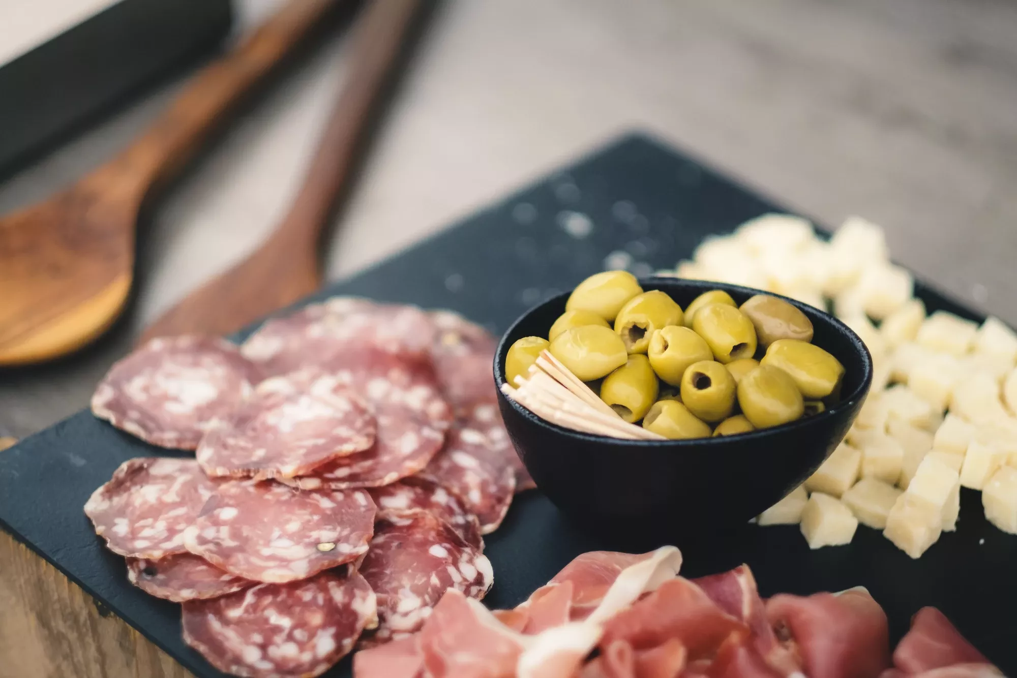 Elegante leistenen bordjes met Italiaanse specialiteiten zoals Felino salami, pittige Spianata, blokjes Parmigiano, Italiaanse ham en olijfjes.